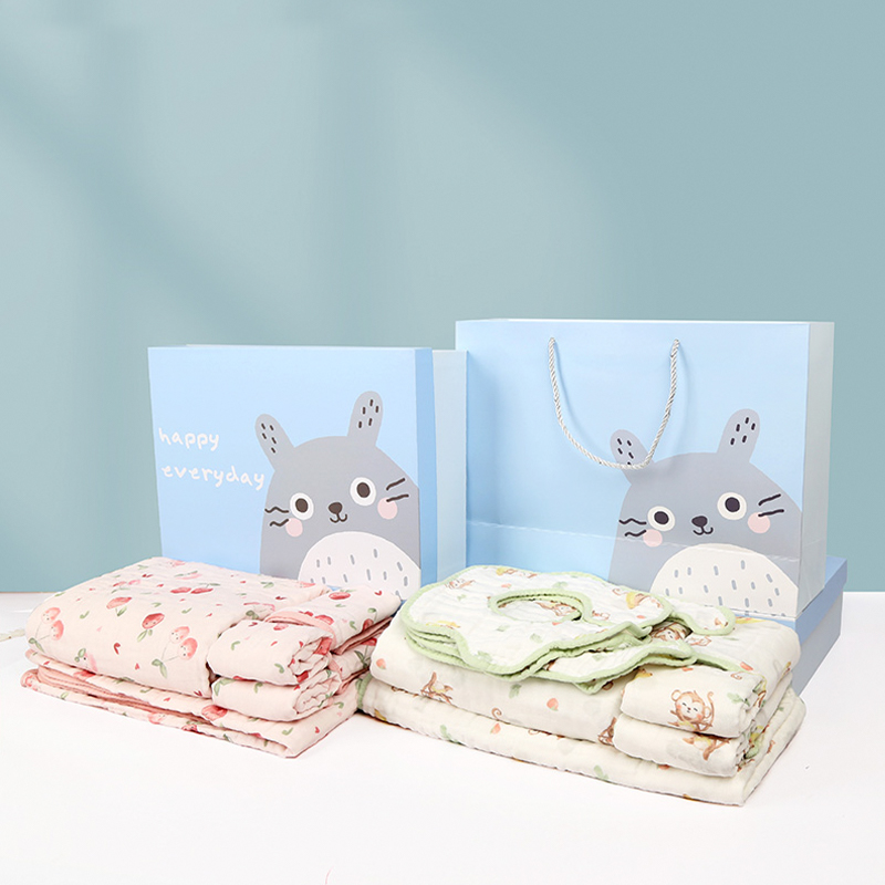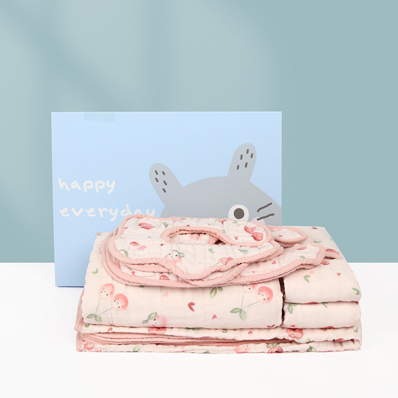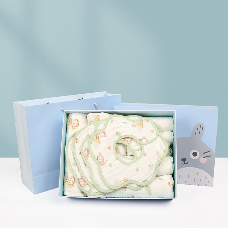 Dos toallas de baño; dos toallas para niños; dos toallas de mano; dos baberos en forma de pétalos; dos pañuelos triangulares para la cabeza; juego personalizable de diez piezas según los requisitos.